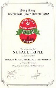 The St. Paul Triple was honoured as best beer at the Hong Kong International Beer Awards of 2010 in the category Best Belgian Style Above 6%.
